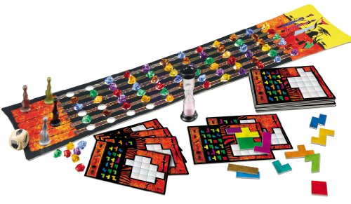 Wenn man die Schachtel in den Händen hält, fühlt man sich gleich in eine andere Welt versetzt. Die angenehme Farbgebung und die afrikanisch anmutenden Zeichnungen lassen gleich Atmosphäre aufkommen. Auch wenn die Farbgebung der vier Figuren ungewohnt ist, kein Rot, Blau, Grün und Gelb, sondern Silber, Bronze, Gold und Schwarz, ist die gestalterische Arbeit sehr gut gelungen. Neben dem zusammensetzbaren Spielplan mit seinen 72 Mulden liegen dem Spiel noch die passenden 72 Edelsteine und 36 doppelseitig bedruckte Legetafeln bei. Für jeden der 2 bis 4 Spieler gibt es einen Satz mit 12 unterschiedlichen Plättchen und, damit der Druck auch stimmt, liegt dem Spiel eine unnachgiebige Sanduhr bei. Die Spielregel ist kurz und knapp, dafür aber nicht weniger ausführlich. Schon nach kurzer Zeit können die Spieler beginnen und auch Kinder ab 8 Jahren werden kaum länger benötigen. Nach 20 bis 30 Minuten ist das Spiel beendet und es würde mich wundern, wenn dann nicht Rufe nach mehr zu vernehmen wären!