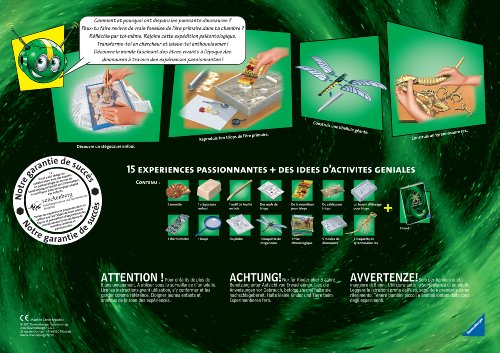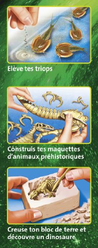 - Contenu : 1 sachet avec des oeufs de triops, du sable, de la nourriture pour triops, 1 aquarium, du plâtre, 5 différents moules, des pots de peinture, 1 Meganeura en carton, 1 Tyrannosaurus en carton, 1 pain d"argile à creuser, 1 stylet en bois, 1 notice détaillé