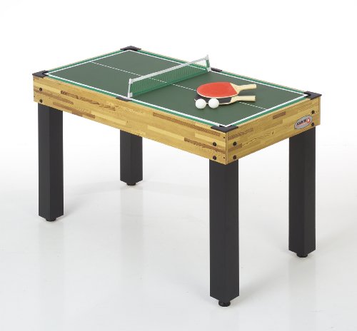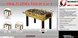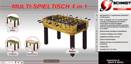 Der Multi-Spieltisch 4 in 1 ist der vielseitigste Verwandlungskünstler unter den Multifunktionsgeräten im Einsteigerbereich. Spielend leicht für groß und klein umgebaut, bringen die jeweiligen Spiele grenzenlose Spielfreude für alle Altersgruppen. Vier beliebte Spiele können mit nur einem Gerät gespielt werden: – Kicker, Billard, Tischtennis und Speedhockey- Kicker-Spielfläche: 105 x 58 cm, 13 mm Stahlstangen- Lieferung inkl. Komplett-Zubehör für alle Spiele- Aufstellmaß: 107,5 x 61 x 80 cm- Gewicht: 30 kg- Spieltischhöhe: 83 cm