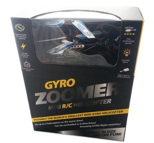 La sua lunghezza di solo 11 cm lo rende il più piccolo Elicottero altamente controllabile con giroscopio al mondo, per una grande dose di DIVERTIMENTO! Questo meraviglioso elicottero è appena comparso nel Regno Unito, e non dev'essere confuso con altri Mini Elicotteri Radiocomandati. Può essere facilmente controllato verso tutte le direzioni una precisione tale da lasciarti stupito! I principianti possono far volare il loro elicottero direttamente fuori dalla scatola, senza dover fare altro, ed è realizzato con un materiale unico resistente alle collisioni, per resistere alle varie cadute che possono verificarsi mentre impari a padroneggiare i comandi. Nel caso in cui si verifichi il peggio, ogni elicottero è provvisto di 2 eliche posteriori di ricambio e 1 set di lame principali per fare in modo che la tua pausa dal volo duri il meno possibile. Per cadute estreme, è disponibile da noi una pratica parte posteriore dell'elicottero di ricambio. L'elicottero con Gyro Zoomer è anche un grande divertimento per piloti con più esperienza; puoi effettuare una vasta gamma di manovre, con il solo limite della tua immaginazione ed esperienza, e puoi controllarlo in non meno di 6 direzioni. E, per quanto riguarda la durata dei voli, il divertimento dura 6-8 minuti dopo un insignificante tempo di ricarica di solo 20-25 minuti. Oltre al metodo tradizionale di ricarica tramite il telecomando, l'elicottero è provvisto di un cavo USB per ricaricarlo ancor più rapidamente attraverso la porta USB del tuo computer. L'ultimo elicottero radiocomandato include anche l'autoselezione del canale, così uno qualsiasi dei 3 modelli, indipendentemente dal colore, può volare nello stesso momento (devi solo selezionare bande diverse sui telecomandi, così gli elicotteri possono volare su 3 bande differenti).
