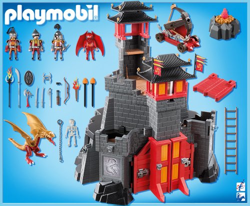 Riesenburg mit goldenem Drachen, Drachenfeuer (benötigt 1 x 1,5V Micro-Batterie) und mobiler Feuerkanone. Mit großer Felshöhle zum Aufklappen, Fallgitter und ansteckbarem Drachen-Landeplatz. Die Falltür führt ins finstere Burgverlies.