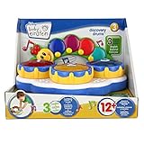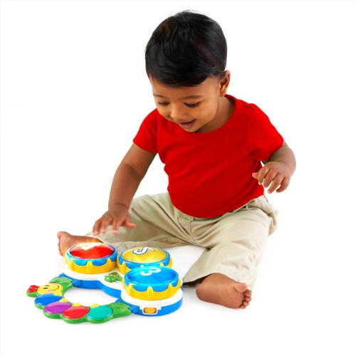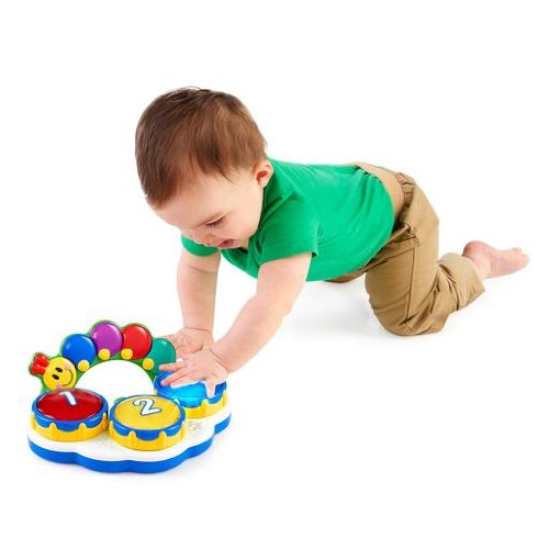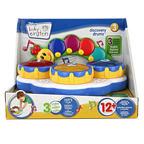 Baby Einstein delivers drumming fun for baby and a whole lot more. Discovery Drums provide three modes of play so baby can discover music, numbers, and colors. In music mode, infants “drum up” their own music in free play or listen to 12 classical melodies to enjoy during naptime or playtime. When a drum is touched in either number or color mode, baby listens as each number or color is spoken in English, Spanish, or French. For more entertaining fun, baby also enjoys flashing lights when hitting a drum, no matter what mode. The convenient and colorful caterpillar handle provides easy portability for on the go fun. Includes volume control and 3 AA batteries.